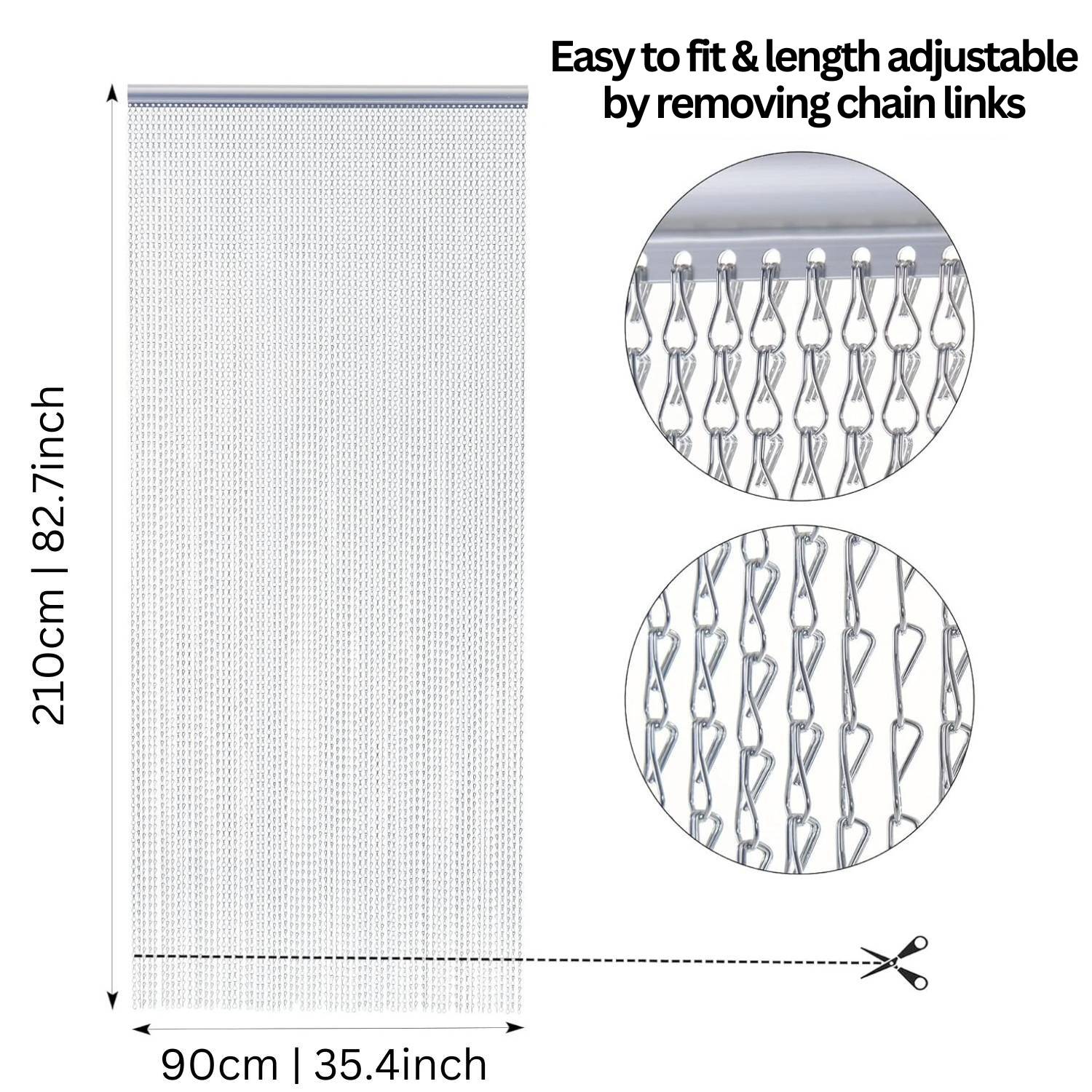 Easy to fit. Easy to remove the chain links to get perfect length. Light weight but very sturdy chain. Photo is 2 screens together for a wide double opening. Effective and very noticeable reduction in flying bugs in the house