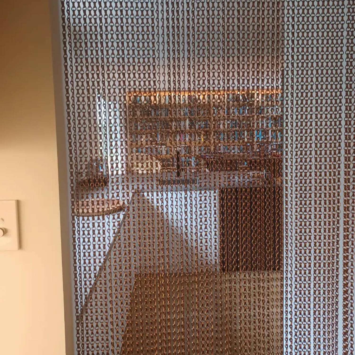 A chain link curtain provides a semi-barrier for doorways, offering partial security while maintaining visibility and airflow.